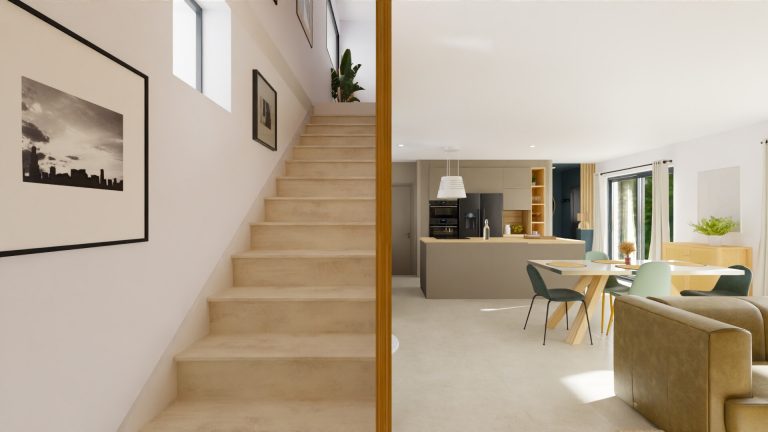 Ce projet concerne la conception d’une maison à partir de plans 2D, avec des contraintes telles que des murs porteurs déjà érigés. Les points d’eau sont également préétablis. Sur une surface de 140m2 dédiée aux pièces de vie, l’objectif a été d’adapter, de designer et de rendre fonctionnels ces espaces pour répondre aux besoins d’une vie de famille. Une proposition de matériaux et de couleurs dans les mêmes tonalités a été faite pour assurer un rendu d’ensemble personnel et harmonieux. Une shopping list à été transmise pour une livraison de projet tout en un.